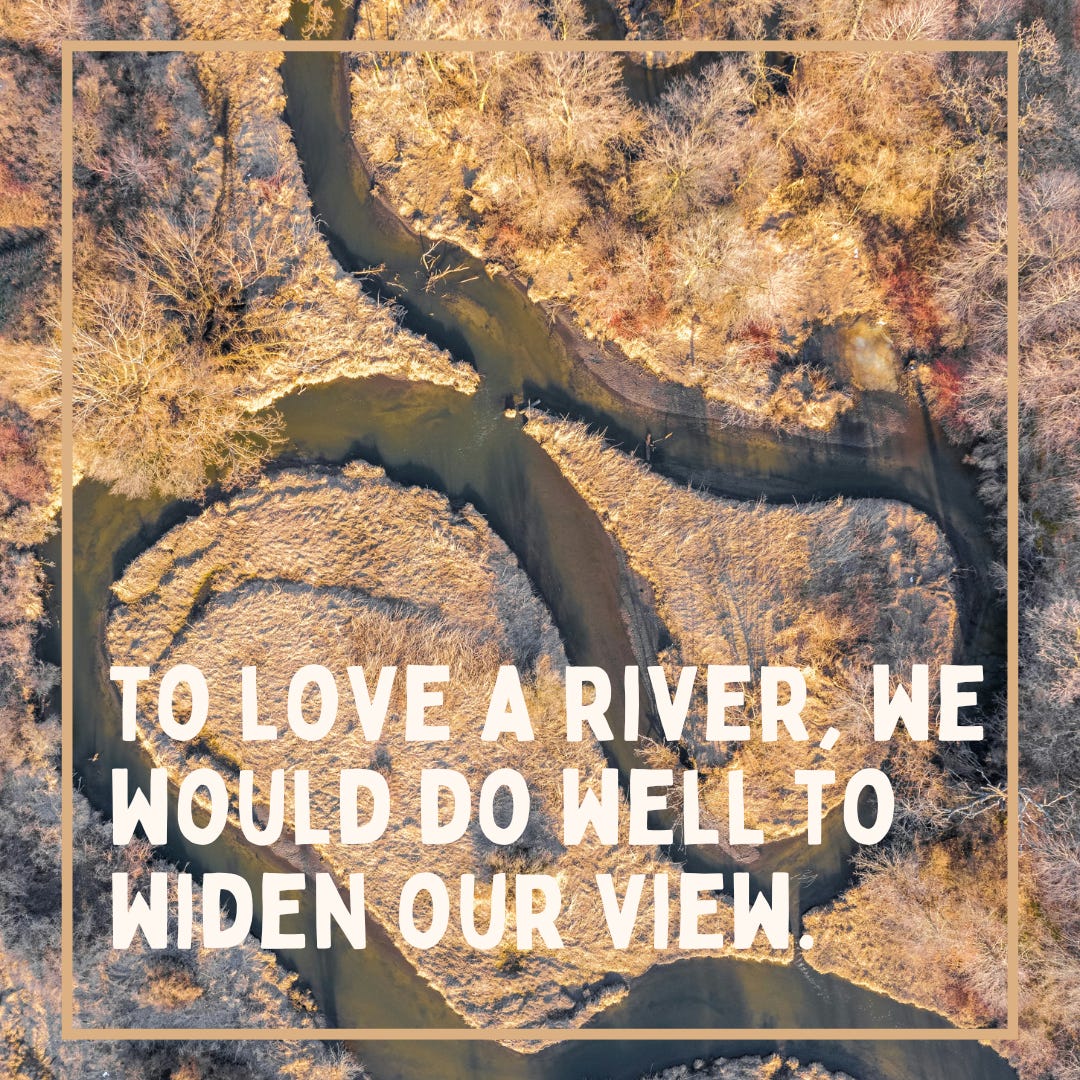 To love a river, we would do well to widen our view. Rivers not only run over vast distances, they change drastically over centuries-long timescales. Nor can they be viewed as isolated individuals. They exist within a network of relationships with other habitats, including wetlands, lakes, streams, and more. Rivers are so much grander than the span of water we see when we stand on their banks. From that limited point of view, a river challenges our spatial and temporal awareness, asking us to reject outdated and imperfect notions of isolated environments and replace them with much more meaningful relationality.