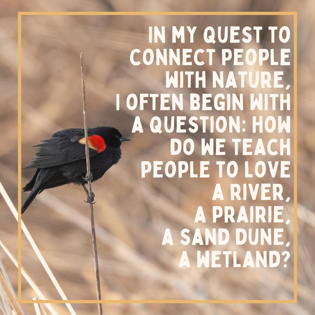 In my quest to connect people with nature, I often begin with a question: how do we teach people to love a river, a prairie, a sand dune, a wetland—and by extension all the beings that rely on them for survival? Key to the solution is building relationships with these places by spending time with them. We are more likely to defend the forest where we jog, the riverside trail where we cycle, the lake where we learned to fish, or the bluffs where we sit and read. Places become meaningful to us as we get to know them, as our memories of visiting these places—the experiences we have there, alone or with others—infuse them with meaning. Giving attention to how the seasons alter these landscapes, which plants and birds are present or absent during each new month of the year, these ways of noticing add nuance and depth to our relationship with land and water.